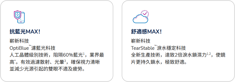 全新生產技術,將淚水鎖濕力提升兩倍1,2,使配戴時間更長更舒適^。更適合眼睛易乾、長時間使用電子螢幕、想過濾光害的你。