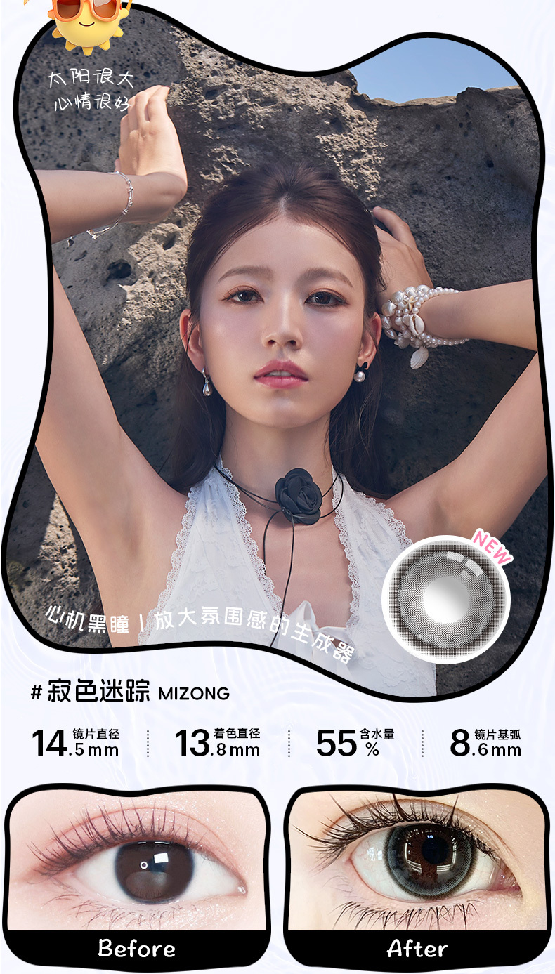 自然增大直徑: 採用細緻嘅 13.8mm 著色直徑,而鏡片直徑為 14.5mm。呢個尺寸令眼睛有微微放大嘅效果,增加眼神嘅深邃度,但唔會過於突兀,呈現出自然亮眼嘅效果。