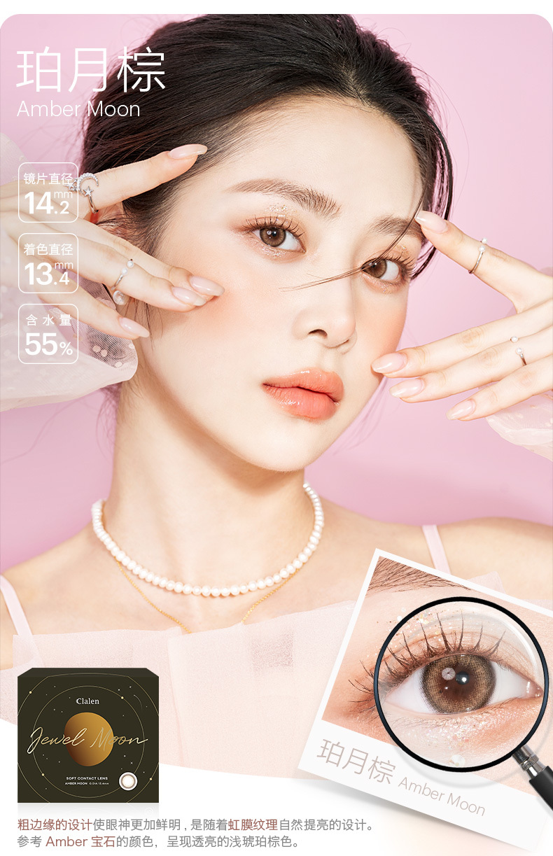 Clalen Jewel Moon Amber Moon 系列係 Clalen 嘅全新力作,專為追求眼神有「星光」、同時保持極致透明感嘅時尚用戶而設。Amber Moon 色號憑藉其獨特嘅放射狀星月圖案透明琥珀棕色調,為你打造猶如星河閃爍般迷人、亮眼嘅眼瞳。