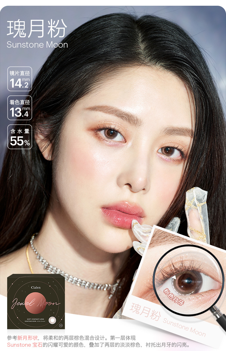 Clalen Jewel Moon Sunstone Moon 系列係 Clalen 嘅全新力作,專為追求甜美個性、浪漫異國風情、同時帶有星光感嘅時尚用戶而設。Sunstone Moon 色號憑藉其獨特嘅放射狀星月圖案同透明寶石粉色調,為你打造猶如星河閃爍般迷人、亮眼嘅眼瞳。