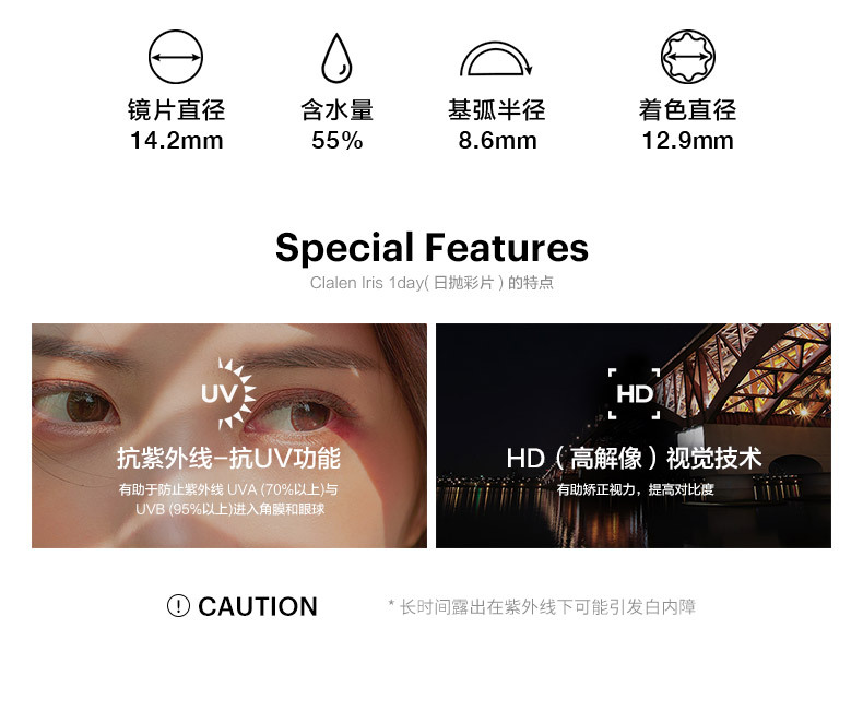 高效鎖水材質:採用 Clalen 獨家 ULTRA SOO™ 高效鎖水技術,添加透明質酸鈉(HA)成分。擁有 55% 高含水量,能長時間鎖住水分,減少眼乾情況,即使長時間配戴工作或社交,依然能保持水潤感同極致舒適度。